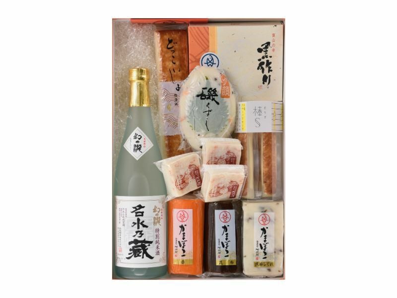 | 内容(量) | ・幻の瀧 名水乃蔵 特別純米酒(720ml) ・【棒S】元祖スティックチーズ ・【小巻】赤・昆布しぐれ・昆布巻 ・【磯くずし】夕顔 ・【どっこいしょ】焼 ・紅ズワイガニ蒲鉾3 ・黒作り |