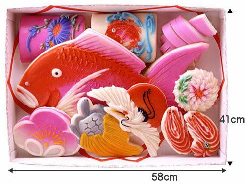 | 内容(量) | 重さ : 10,100g ■鯛 : 約4,500g ■斗棒 : 約2,500g ■鶴 : 約550g ■亀 : 約650g ■梅 : 約650g ■菊 : 約300g ■海老対 : 約300g ■結び : 約650g |