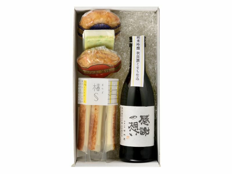 | 内容(量) | 【棒S】元祖スティックチーズ 【カリー蒲鉾】ホタテ、エビ 【えだまめ畑】 【魚津酒造】純米吟醸 秋田酒こまち(300ml) |