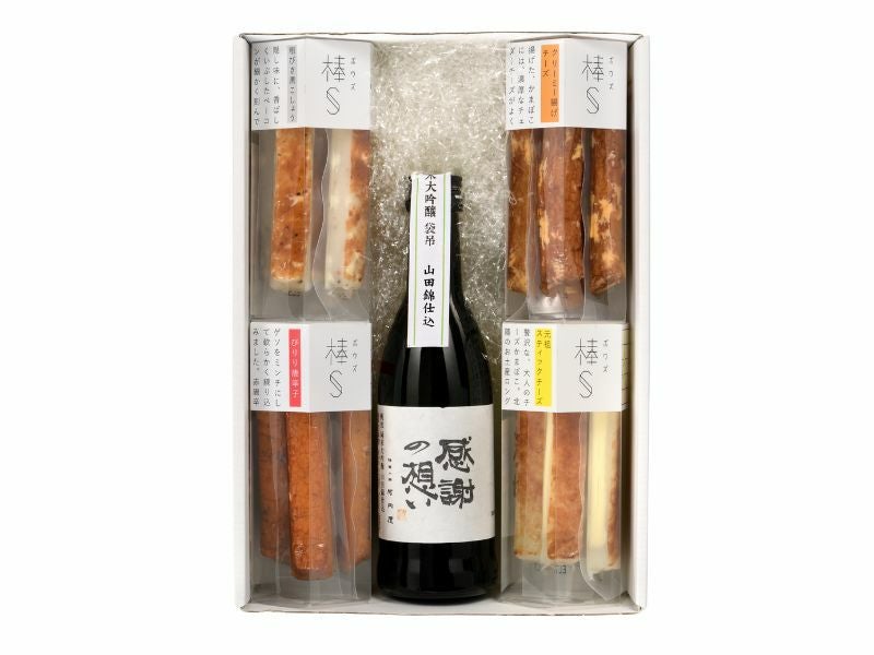 | 内容(量) | 【棒S】元祖スティックチーズ、ぴりり唐辛、粗びき黒こしょう、クリーミー揚げチーズ 【魚津酒造】純米大吟醸原酒 袋吊(山)山田錦仕込(300ml) |