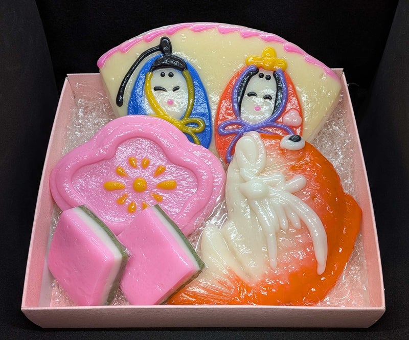 | 原材料名 | 【ひな扇】 魚肉、みりん、食塩/加工でん粉、調味料(アミノ酸等)、甘味料(ステビア)、着色料(赤3、アナトー、赤106、カロチン、青1、ビタミンB2、ウコン、炭末)、(一部に鮭を含む) 【ひし形】2 魚肉、よもぎ、みりん、食塩/加工でん粉、調味料(アミノ酸等)、甘味料(ステビア)、着色料(赤106)、(一部に鮭を含む) 【桃の花】 魚肉、みりん、食塩/加工でん粉、調味料(アミノ酸等)、甘味料(ステビア)、着色料(赤106、カロチン)、(一部に鮭を含む) 【豆鯛】 魚肉、みりん、食塩/加工でん粉、調味料(アミノ酸等)、甘味料(ステビア)、着色料(赤3、アナトー、炭末)、(一部に鮭を含む) |