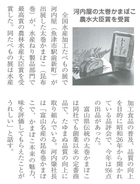 第62回全国水産加工たべもの展で、河内屋の「太巻かまぼこ(昆布巻)」が農林水産大臣賞を受賞しました!