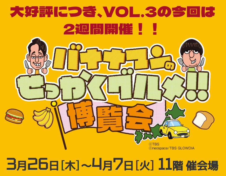 TBSの人気番組「バナナマンのせっかくグルメ!!」でバナナマン日村勇紀さんや多彩なゲストが全国各地で堪能した絶品グルメが一堂に集結する博覧会です。