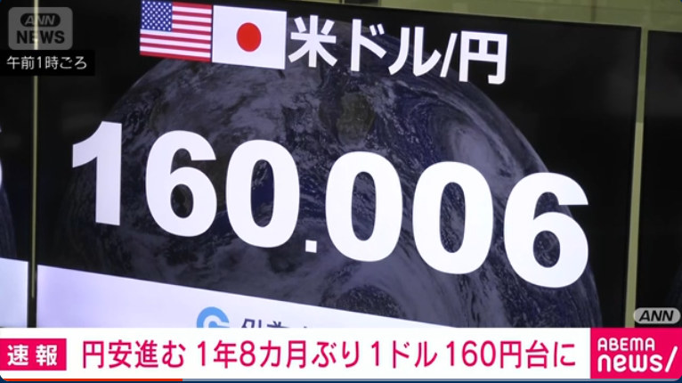 久しぶりに円が一時1ドル=160円台をつけました。
